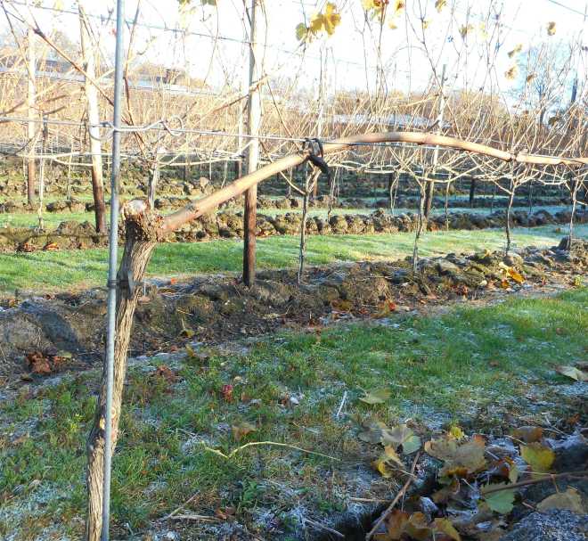 Onze wijngaard rust in de winter. Ook in de wijnwereld zijn januari en februari rustige maanden. In grote wijngaarden wordt vanaf een week na de oogst en tijdens de vorstvrije perioden begonnen met snoeien en worden palen en draden gerepareerd.