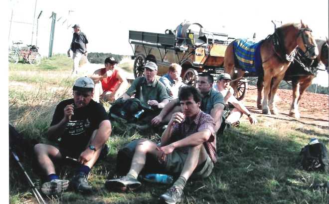 De tocht wordt vervolgd door zeer mooi bosgebied. De middagpauze is zeer ruim genomen, er is goed gegeten en door het warme weer zeer veel water gedronken (wel 3 ltr p.p.).